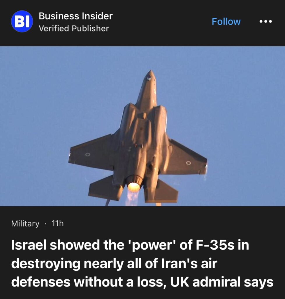 9。据Business Insider报道,英国海军上将表示,以色列展示了 F-35 的“威力”,无一损失地摧毁了伊朗几乎所有防空系统。