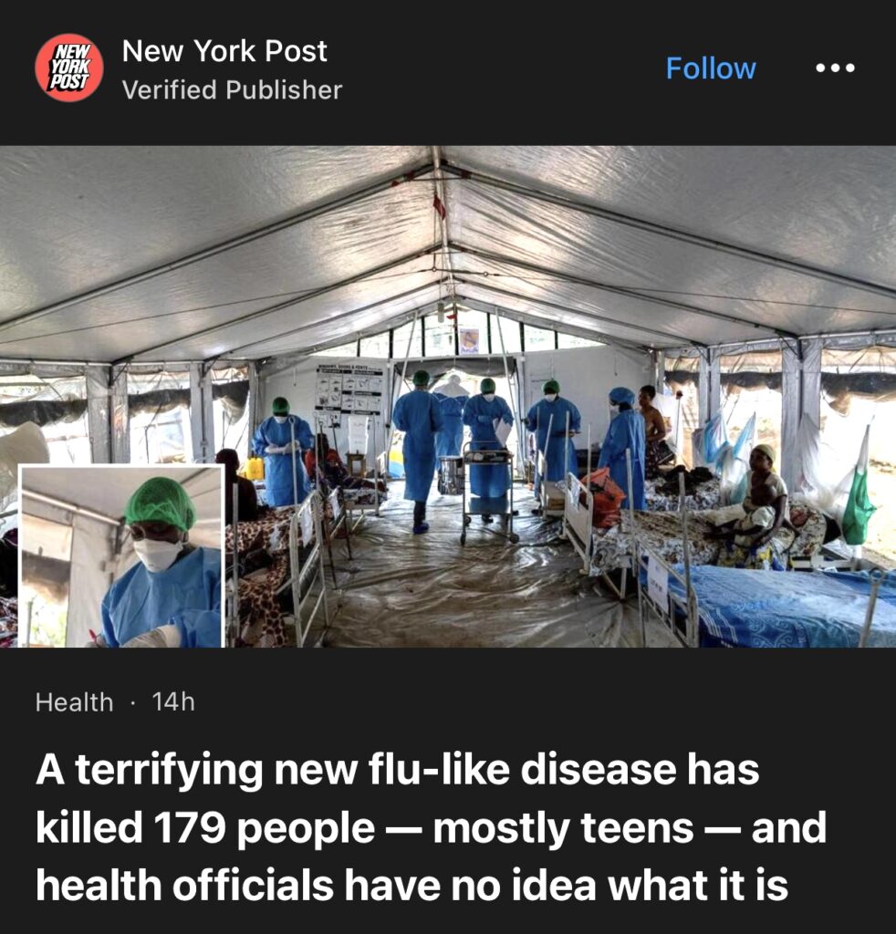 7。据New York Post报道,一种可怕的新型流感式疾病已导致 179 人死亡,其中大部分是青少年,而卫生官员不知道这是什么疾病。刚果民主共和国卫生部告诉BBC,自 11 月 10 日以来,这种不明疾病已感染刚果民主共和国至少 300 人,引起类似流感的症状,包括发烧、头痛、咳嗽、呼吸困难和贫血。