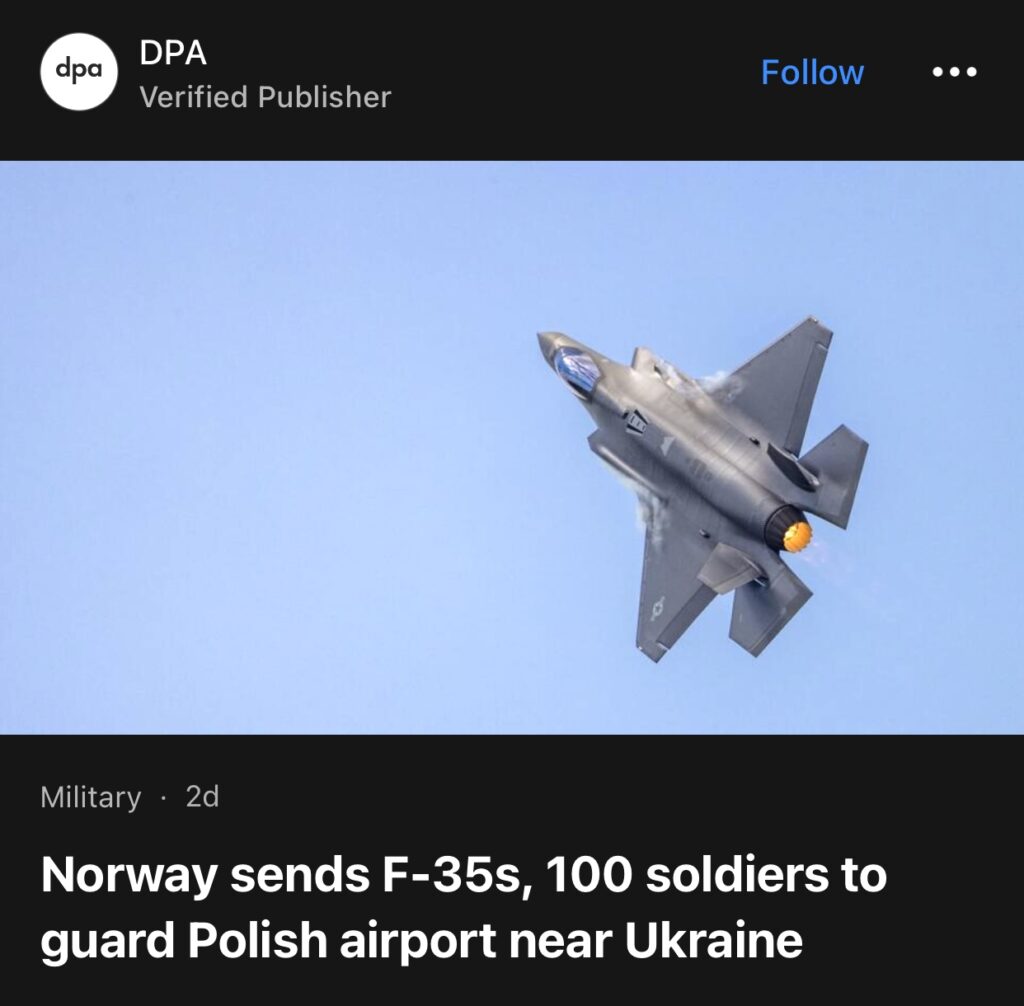 11。据DPA 报道,挪威派遣F-35战机和100名士兵守卫乌克兰附近的波兰机场。