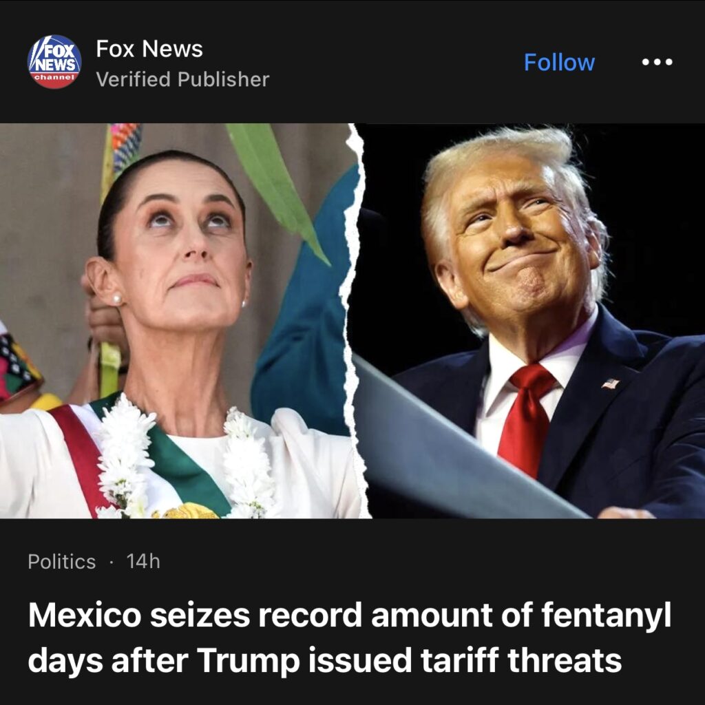 12。据Fox News报道,特朗普发出关税威胁几天后,墨西哥查获了创纪录数量的芬太尼。官员称,墨西哥军方在周二的两次突袭中缴获了一吨多芬太尼药丸,这是该国历史上缉获的最大的合成阿片类药物之一。