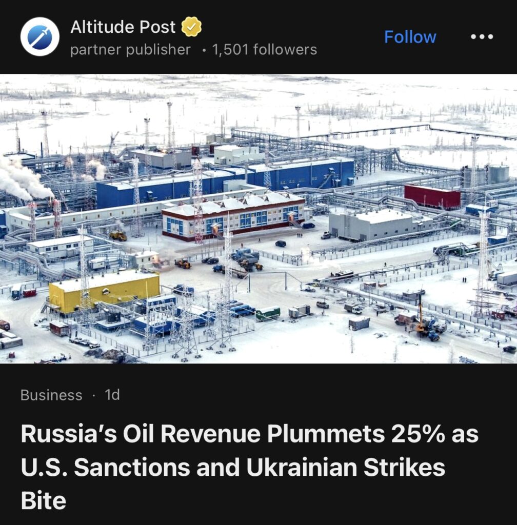 11。据Altitude Post报道,受美国制裁和乌克兰袭击影响,俄罗斯石油收入暴跌25%。
