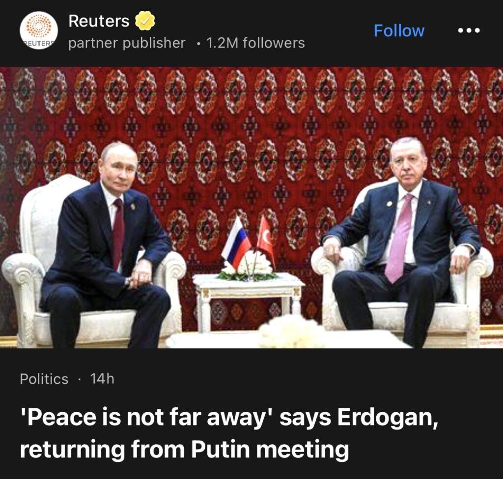 7。伊斯坦布尔,12 月 13 日(路透社)——土耳其总统埃尔多安刚刚与俄罗斯总统普京会晤,他表示希望与美国总统特朗普讨论乌克兰-俄罗斯和平计划,并补充说“和平不远了”。