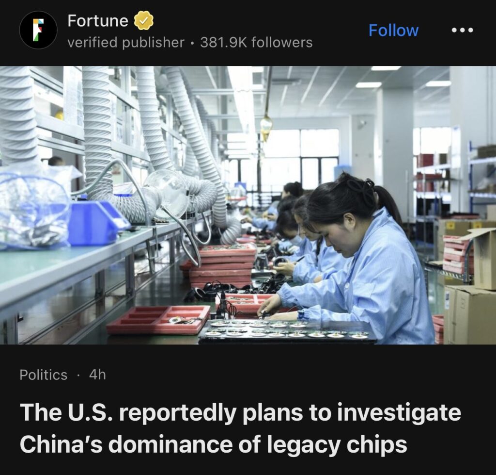 13。据Fortune报道,美国计划调查中国在传统芯片领域的主导地位。