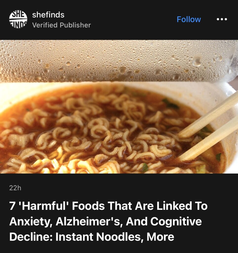 15。据shefinds 报道,7种与焦虑、阿尔茨海默病和认知能力下降有关的“有害”食物:方便面是其中之一。(全文见”世界医学最新简报” worldmednews.com)