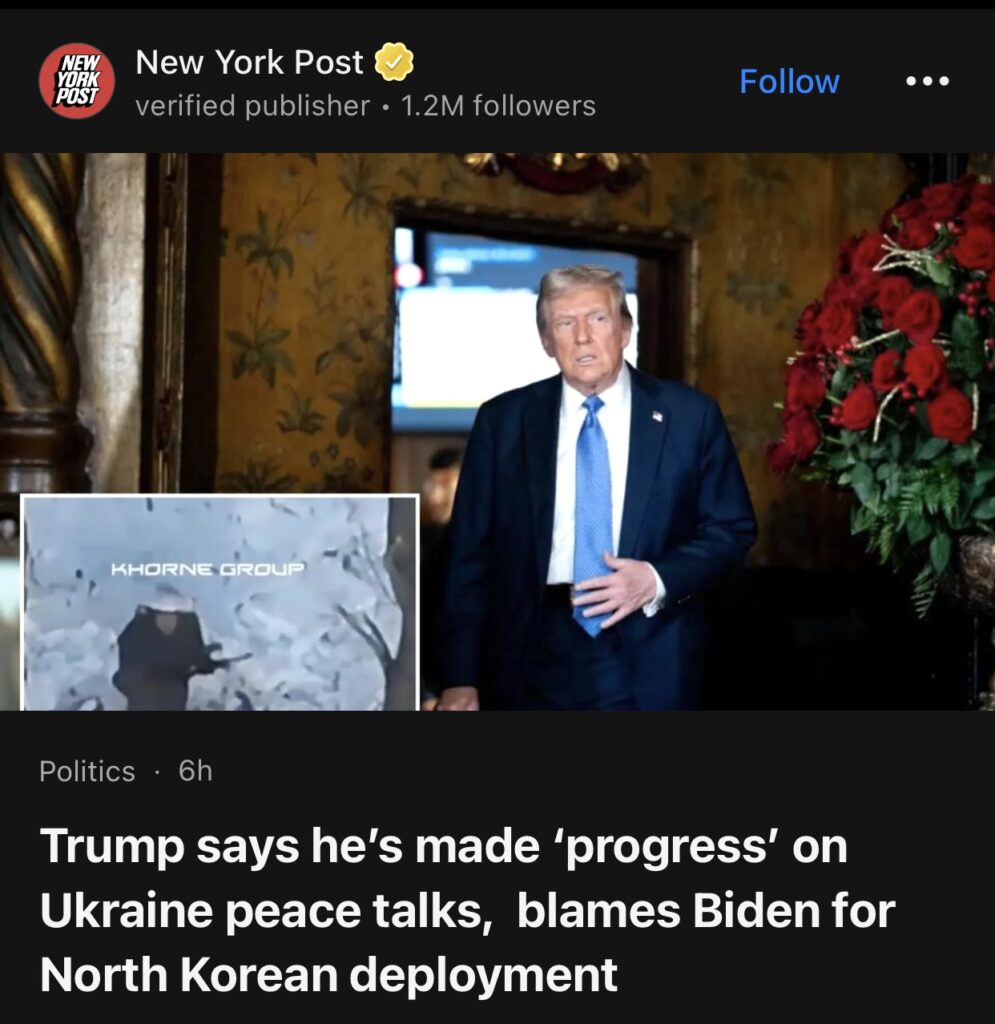 4。据New York Post报道,当选总统唐纳德·特朗普周一表示,他在促成乌克兰和俄罗斯之间达成和平协议方面取得了“进展”,同时指责即将退休的总统拜登发动了朝鲜最近对战争的干预。