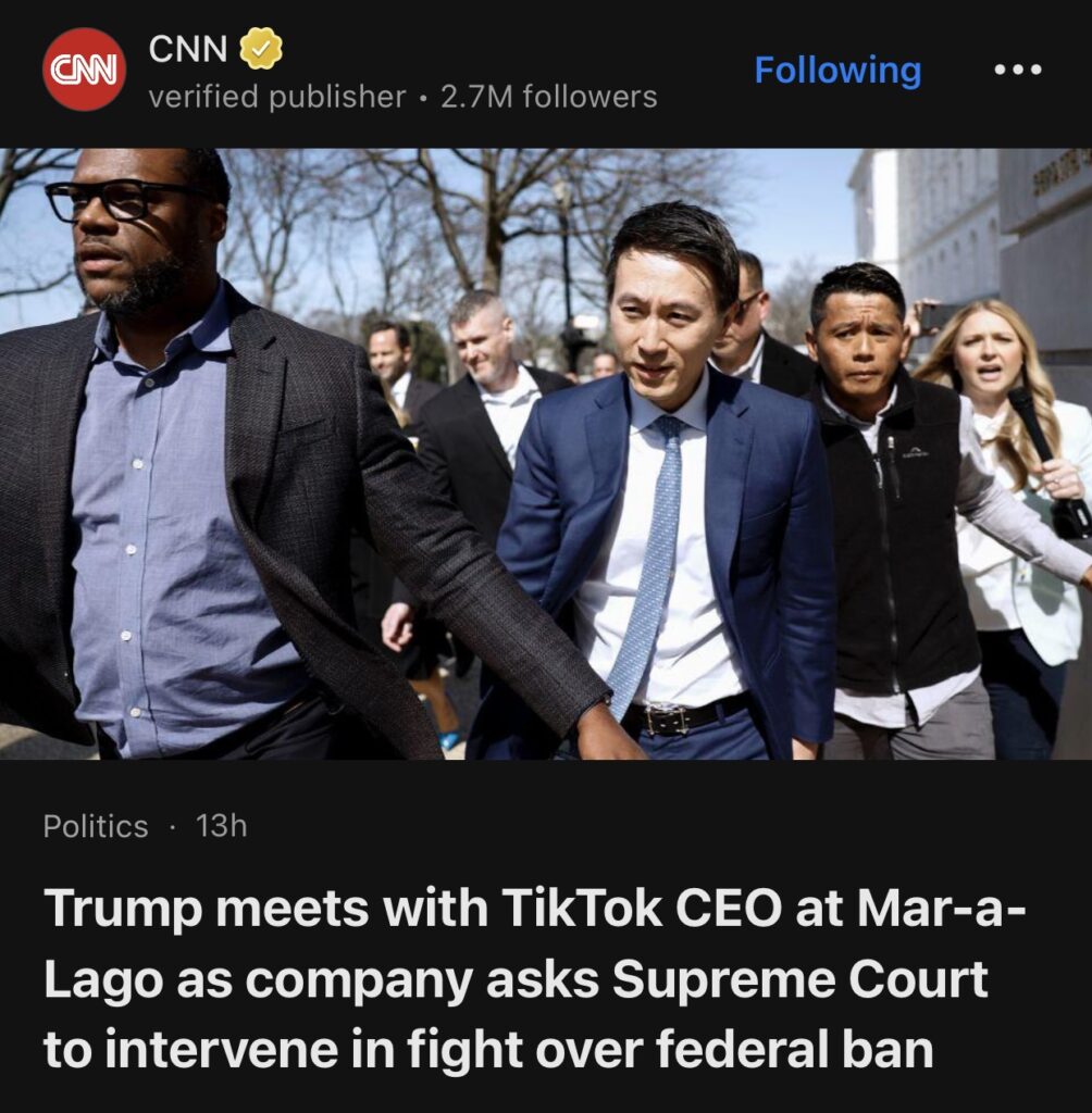 8。据CNN报道,特朗普在海湖庄园会见 TikTok 首席执行官,该公司请求最高法院介入联邦禁令之争。