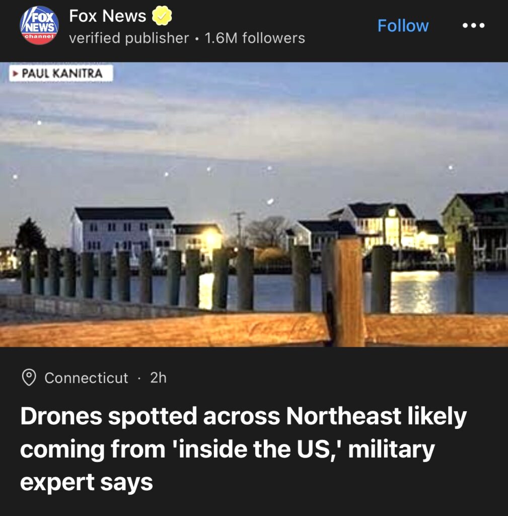 7。据Fox News报道,军事专家称,美国东北地区发现的无人机可能来自“美国内部”。