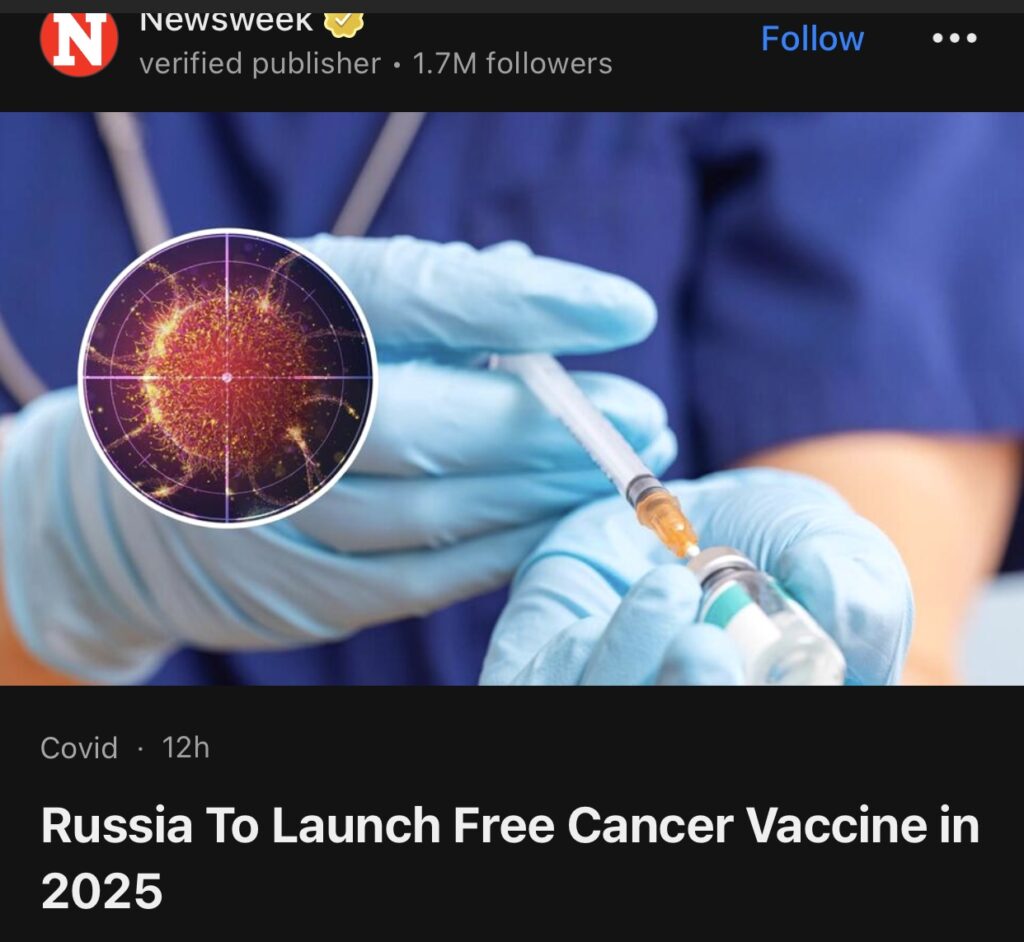 1。据Newsweek 报道,俄罗斯卫生部宣布已研发出一种抗癌疫苗,将从2025年初开始免费分发给俄罗斯患者。