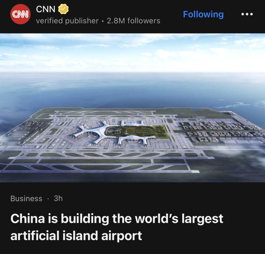 14。据CNN 报道,中国正在建设世界上最大的人工岛机场。目前正在中国东北海岸建设的大连金州湾国际机场最终将覆盖一个面积为 20 平方公里(7.7 平方英里)的岛屿,拥有 4 条跑道和一个 900,000 平方米的客运大楼。