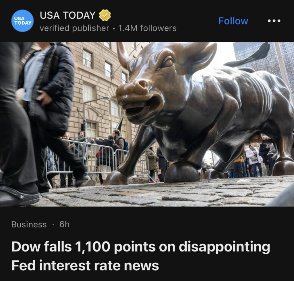10。据USA TODAY报道,美联储利率消息令人失望,道指跌 1,100 点。