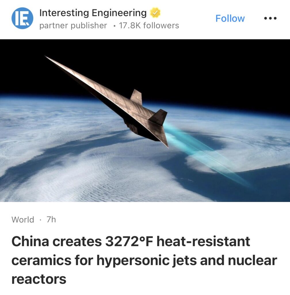 5。据Interesting Engineering报道,中国研制出耐高温达3272°F的陶瓷,用于高超音速喷气式飞机和核反应堆。中国哈尔滨大学的科学家们设计了一种新型的两步工艺,该工艺采用原位反应放电等离子烧结(SPS),以 ZrC、TiSi2 和 B4C 为原料,生产超高温陶瓷 (UHTC)。