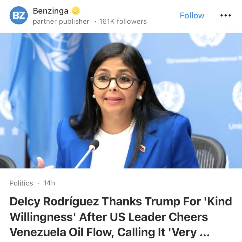 10。据Benzinga报道,委内瑞拉临时领导人德尔西·罗德里格斯周三公开感谢唐纳德·特朗普总统,称她赞赏其政府“为美国和委内瑞拉人民的利益而展现出的友好合作意愿”。