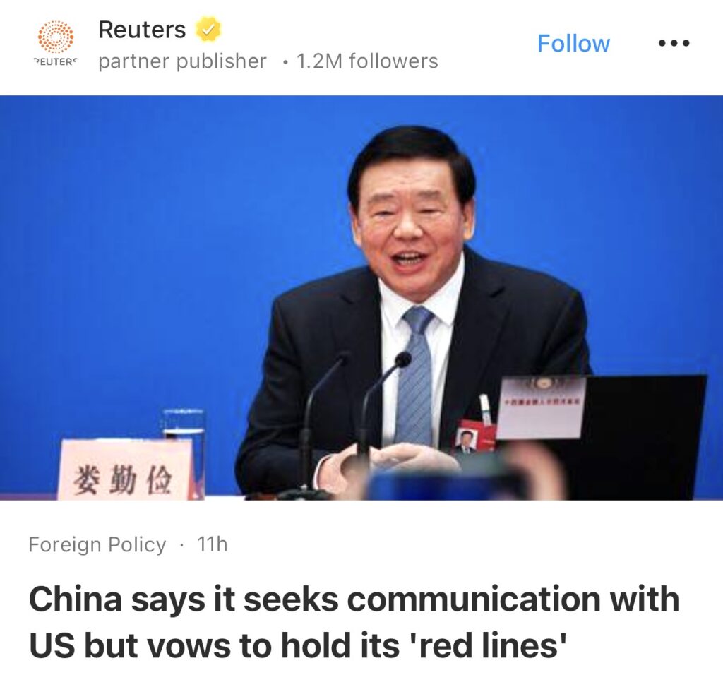 1。北京,3月4日(路透社)——中国全国人大发言人周三表示,中国愿与美国合作,在各层面促进沟通,同时坚持中国的“红线”和原则。