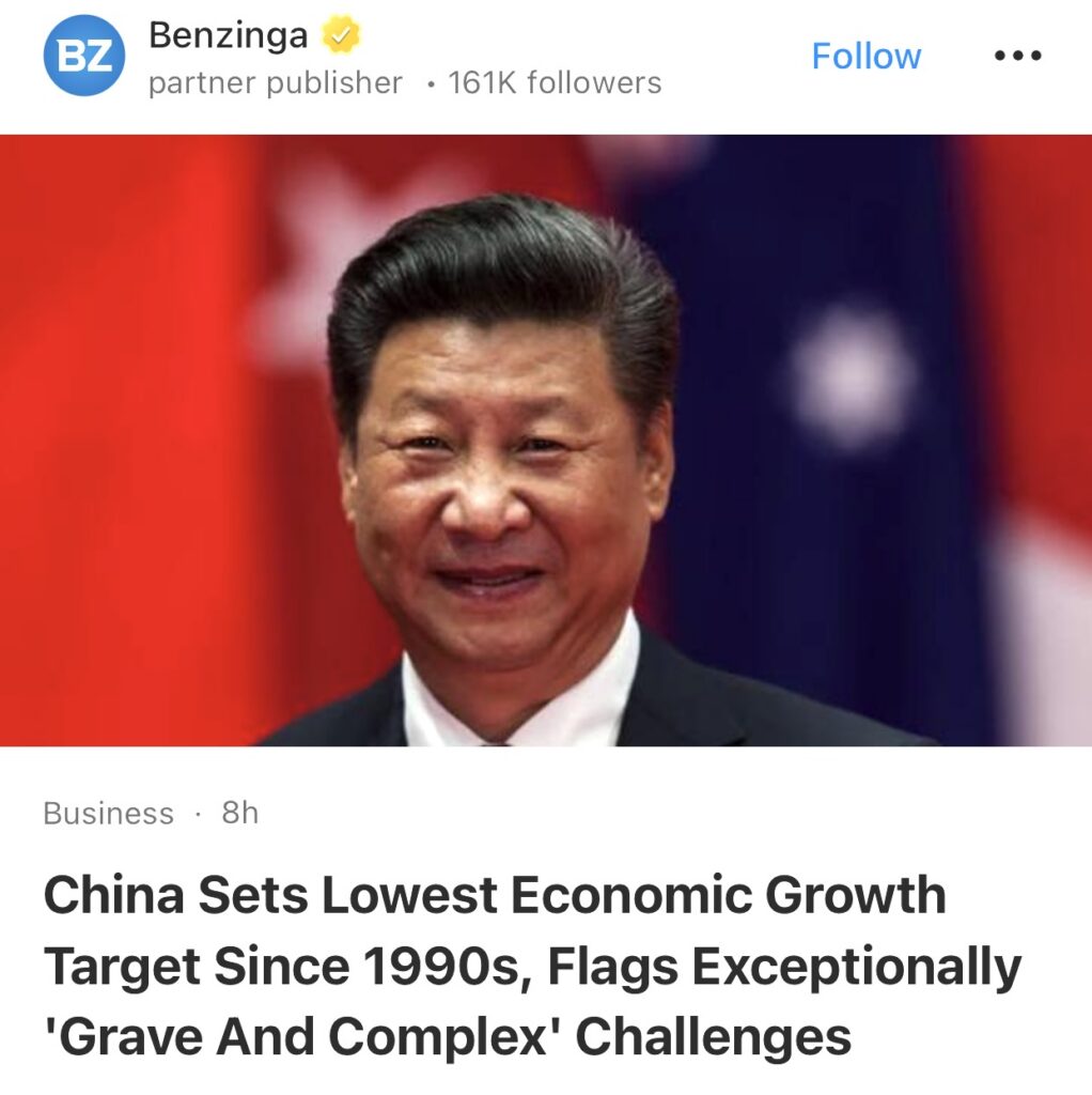 9。据Benzinga报道,中国设定1990年代以来最低经济增长目标,并指出面临异常“严峻复杂”的挑战。中国已将2026年的经济增长目标设定为4.5%-5%,这是自北京在20世纪90年代初开始公布此类数据以来的最低水平。