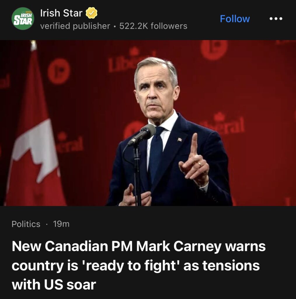 13。据Irish Star报道,加拿大新任总理马克·卡尼警告称,随着与美国的紧张局势加剧,加拿大“准备好战斗”。
