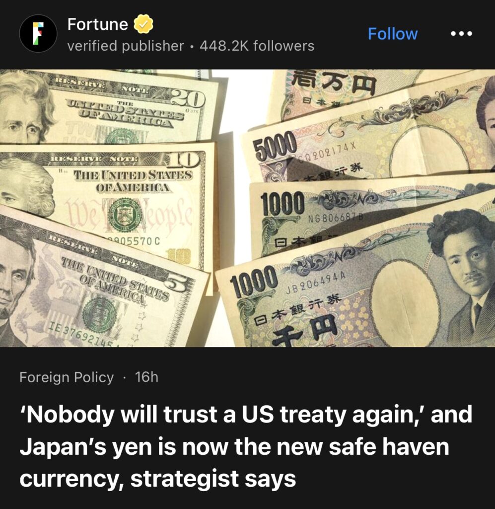 9。据Fortune报道,策略师称,没有人会再相信美国的条约,而日元现在是新的避险货币。量子战略公司的戴维·罗奇表示,随着美国疏远欧洲盟友、与俄罗斯关系升温,“北约已死”。他补充说,这使得普京和习近平成为大赢家,而美国则成为“大输家”,日元将取代美元成为全球避险货币。