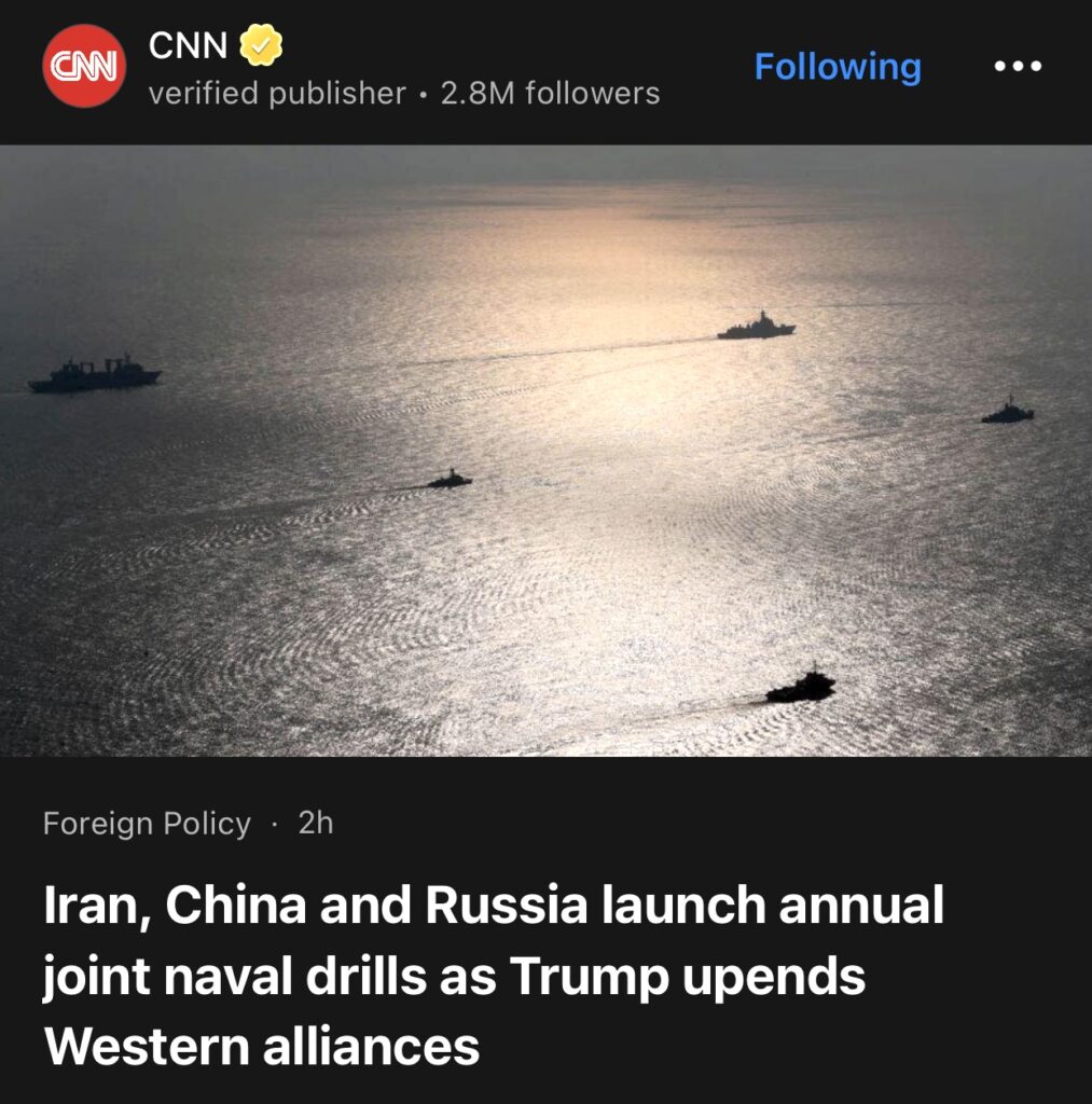 8。据CNN报道,在美国总统特朗普颠覆西方联盟之际,伊朗、中国和俄罗斯启动年度联合海军演习。