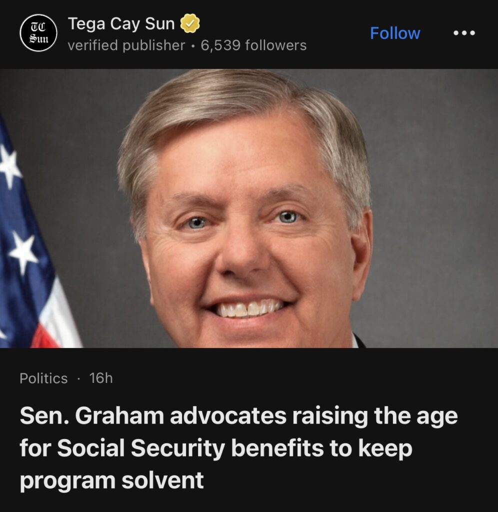 15。据Tega Cay Sun哥伦比亚报道,南卡罗来纳州资深参议员周一表示,国会应该要求人们未来工作更长时间,才能领取全额社会保障退休金,不过他没有提出具体的年龄建议。