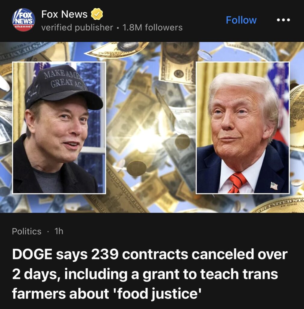 11。据Fox News 报道,DOGE 称两天内取消了 239 份合同,其中包括一项向跨性别农民传授“食品正义”知识的补助金。