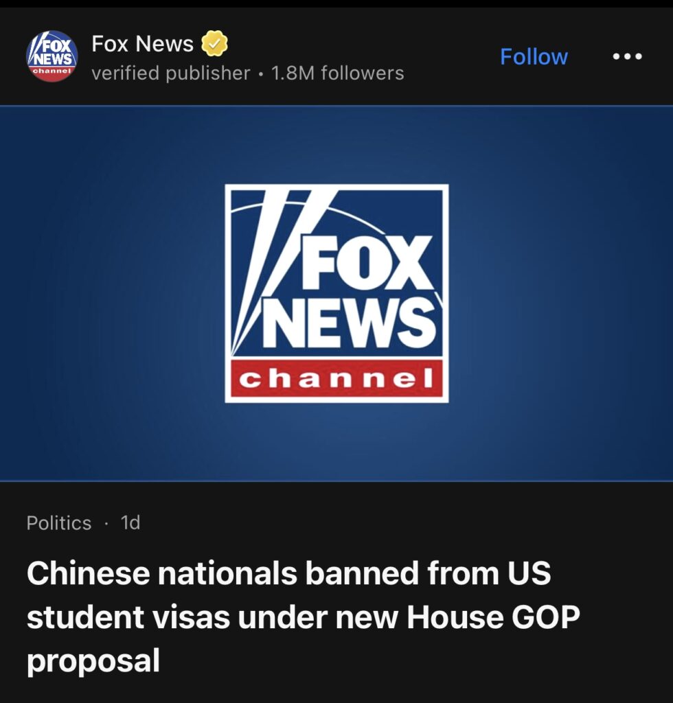 14。据Fox News报道,众议院共和党人正在推动立法,禁止中国公民获得美国学生签证。西弗吉尼亚州共和党众议员赖利·摩尔数周来一直在发出警告,他认为中国共产党 (CCP) 正在利用美国留学签证计划。