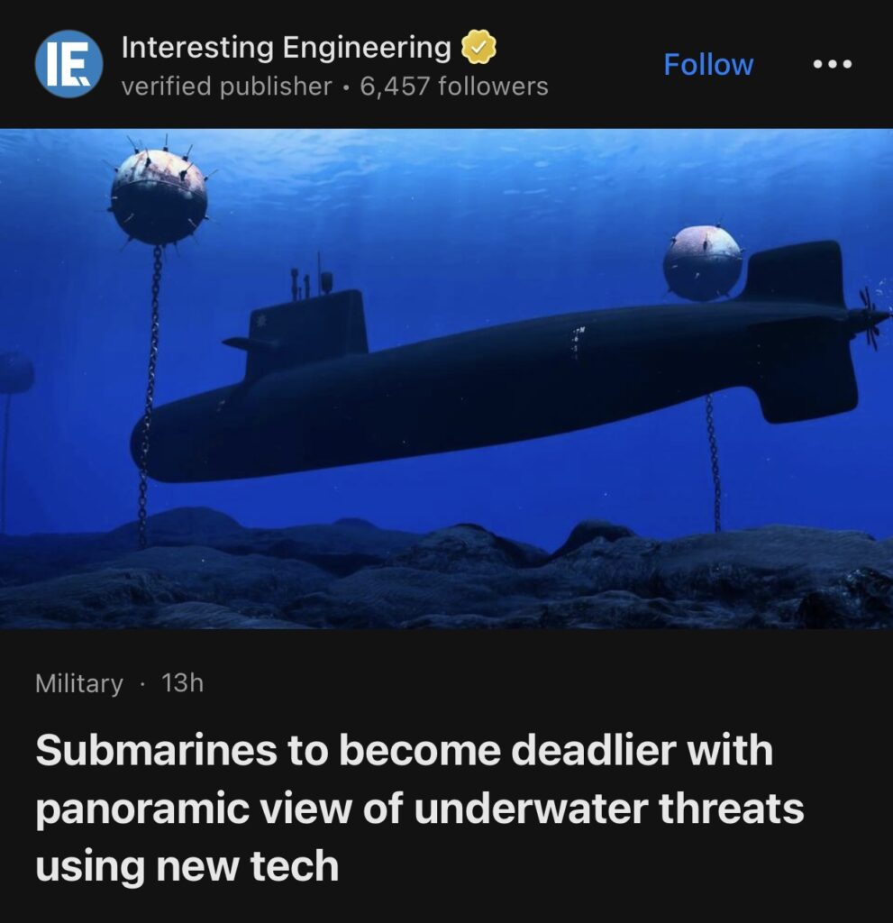6。据Interesting Engineering报道,新技术让潜艇能够全景观察水下威胁,从而变得更加致命。