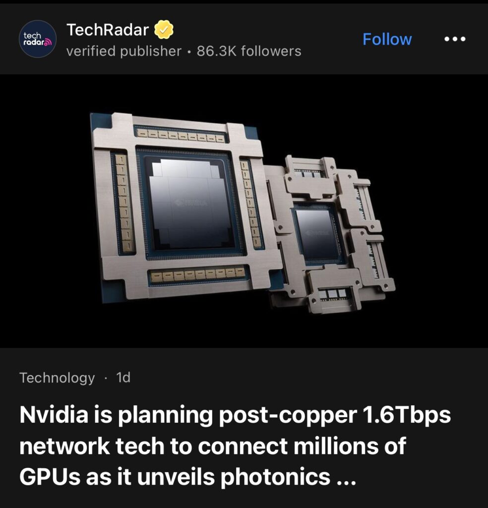 14。据TechRadar 报道,Nvidia 计划采用铜线 1.6Tbps 网络技术连接数百万个 GPU,并在 GTC 2025 上发布光子网络设备。