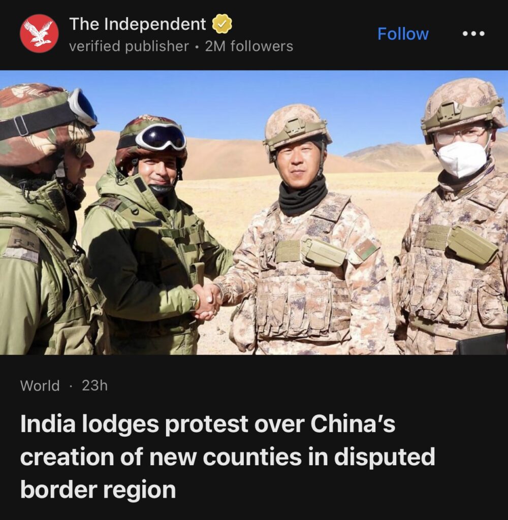10。据The Independent报道,印度对中国在有争议的边境地区设立新县提出抗议。