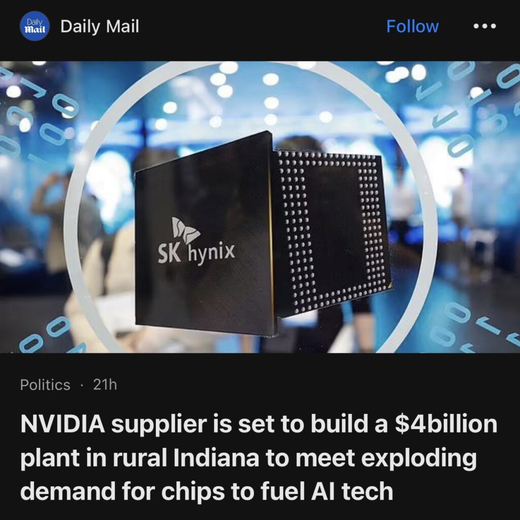 12。据Daily Mail 报道,NVIDIA 供应商 SK Hynix 将在美国印第安纳州西拉斐特建造一座价值 40 亿美元的芯片封装工厂,以满足对人工智能技术不断增长的需求。这家韩国公司是高带宽内存 (HBM) 芯片的顶级供应商,HBM 芯片是 OpenAI 或 ChatGPT 等复杂人工智能应用的重要组成部分。