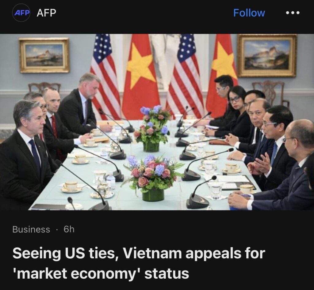 5。据AFP报道,越南周二呼吁美国承认其市场经济地位,并表示加强贸易关系将有利于美国在关键领域的发展。越南和中国是被美国指定为非市场经济国家的十几个国家之一,允许对其出口采取更严厉的行动。乔·拜登总统的政府十月份同意审查越南的地位。
