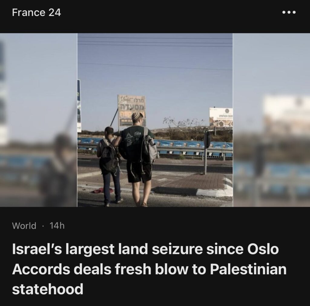 7。据Frence24 报道,以色列周五宣布约旦河西岸800 公顷土地为国家财产,此举将有助于利用这些土地建设定居点。该地区覆盖约旦河谷的大片地区,是未来巴勒斯坦国的重要地区,也是以色列自 20 世纪90 年代初以来夺取的最大一块土地。