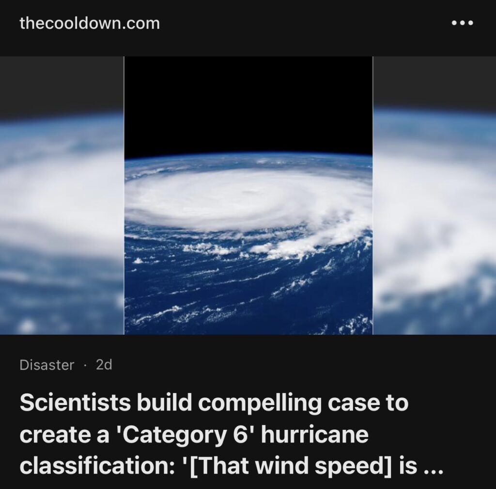 14。据TheCoolDown 报道,科学家们建立了令人信服的案例,来建立“6 级”飓风分类:“[风速]可能比大多数法拉利还要快”。