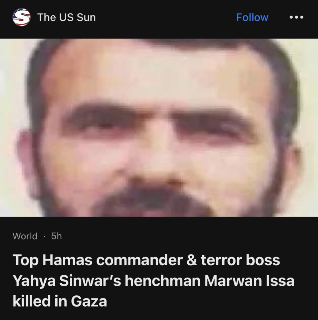 2。据The US Sun报道,哈马斯高级指挥官兼恐怖头目叶海亚·辛瓦尔的追随者,马尔万·伊萨在加沙被击毙。
