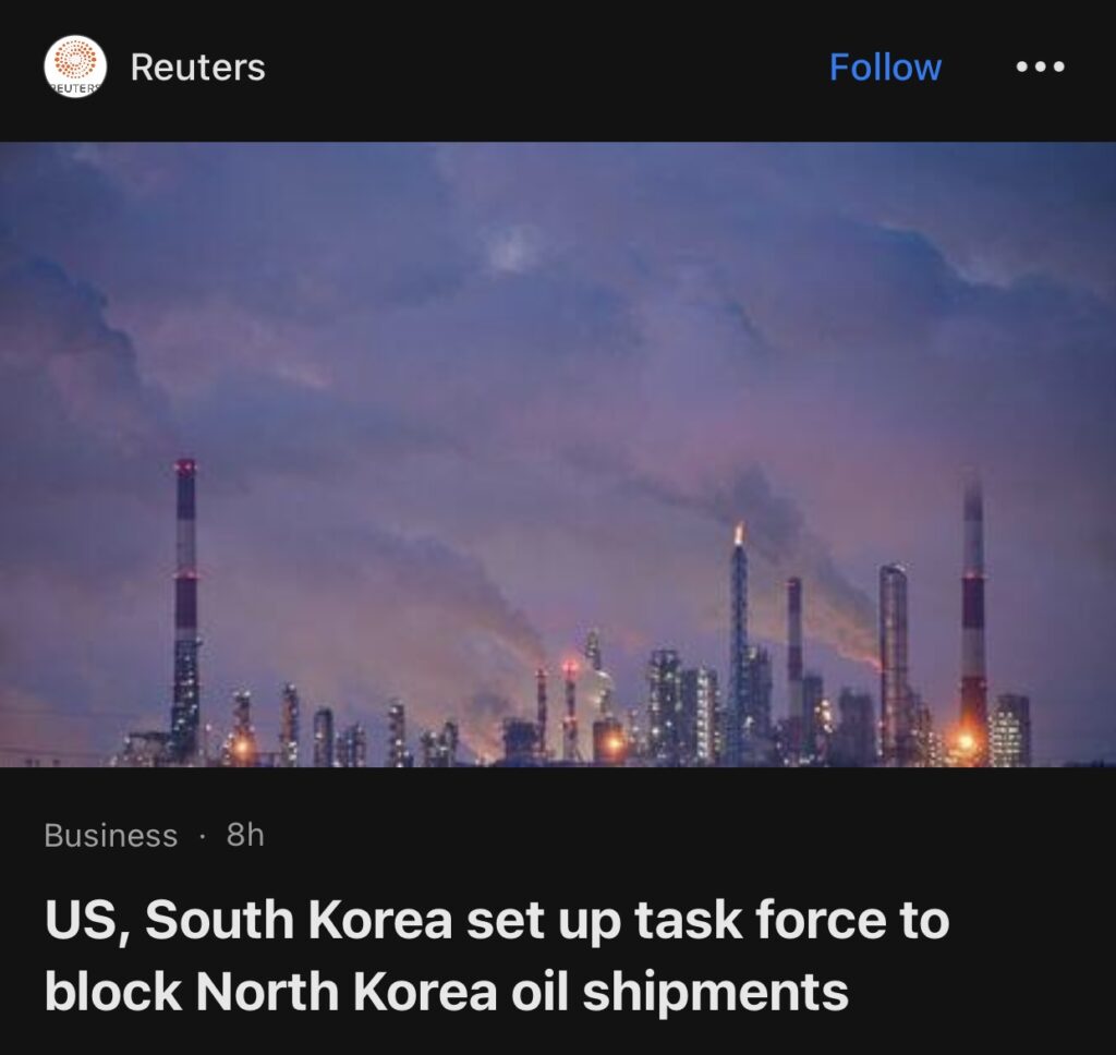 9。据首尔路透社报道,美国和韩国本周成立了一个新的特别工作组,旨在防止朝鲜采购非法石油,因为联合国安理会的僵局使人们对国际制裁的未来产生了怀疑。