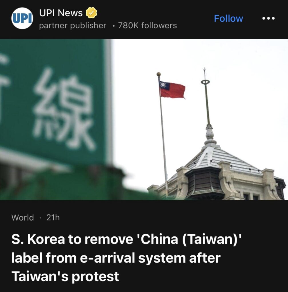 11。据UPI News报道,在台湾抗议后,韩国将从电子入境系统中移除“中国(台湾)”标签。