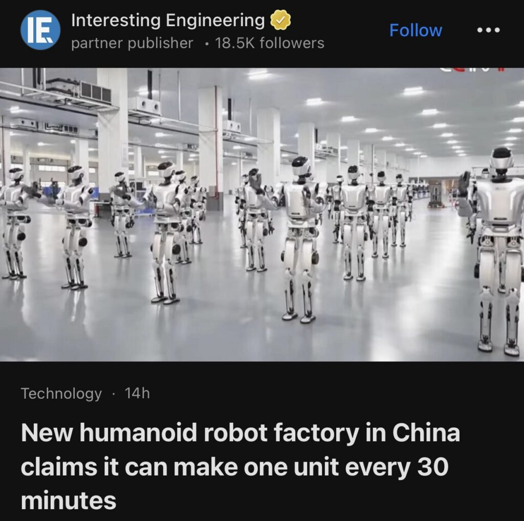 4。据Interesting Engineering报道,中国一家新建的人形机器人工厂声称,每30分钟即可生产一台机器人。