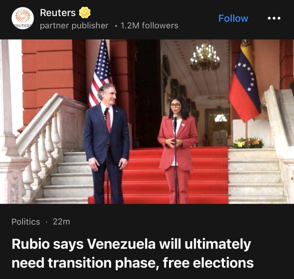 12。据Reuters报道,鲁比奥称,委内瑞拉最终将需要过渡期及自由选举。