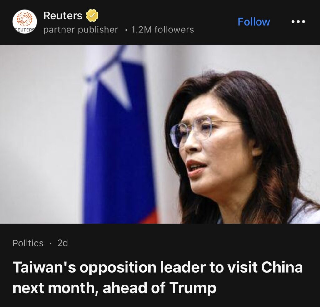 10。北京/台北,3月30日(路透社)——台湾最大在野党中国国民党(KMT)的领导人,应中国国家主席习近平的邀请,将于4月访问中国;此次访问将在美国总统唐纳德·特朗普赴北京举行峰会的一个月前进行。