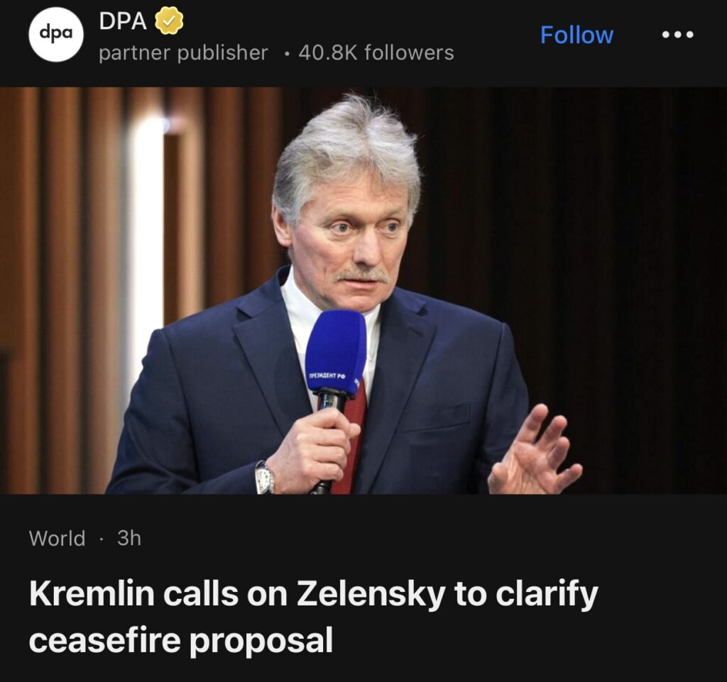 5。据DPA报道,克里姆林宫呼吁泽连斯基澄清停火提议。