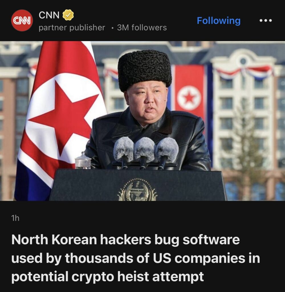 8。据CNN报道,朝鲜黑客在数千家美国企业使用的软件中植入后门,疑似企图实施加密货币盗窃。