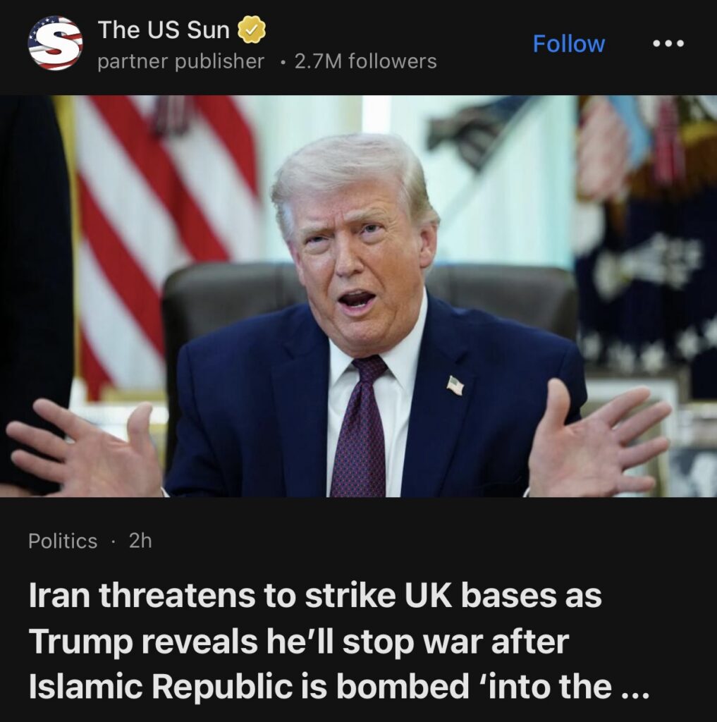 9。据The US Sun报道,伊朗威胁打击英国基地,此前特朗普宣称,待伊斯兰共和国被炸回“石器时代”后,他便会停战。