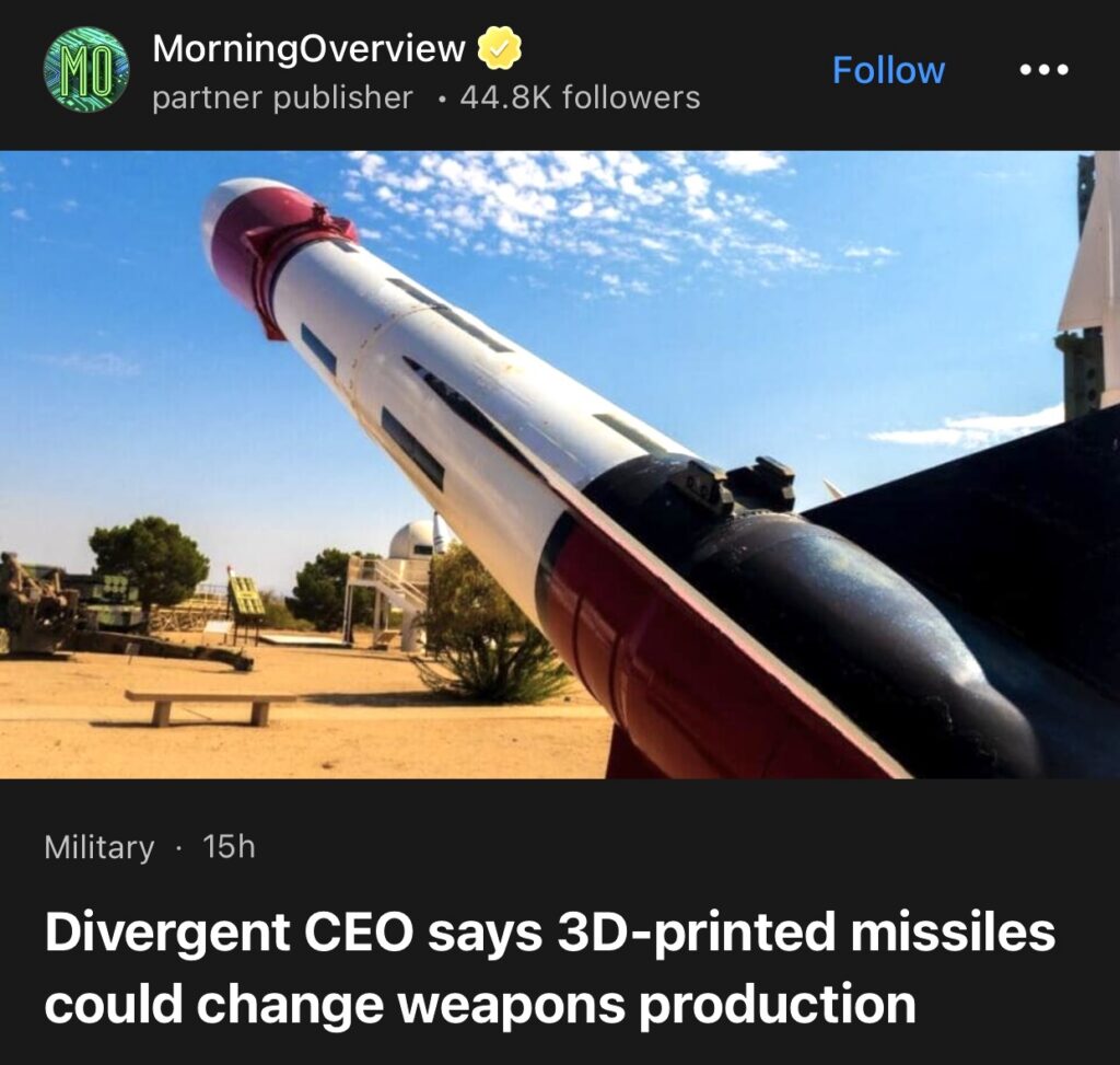 6。据MorningOverview 报道,Divergent CEO 表示,3D 打印导弹或将改变武器生产模式。
