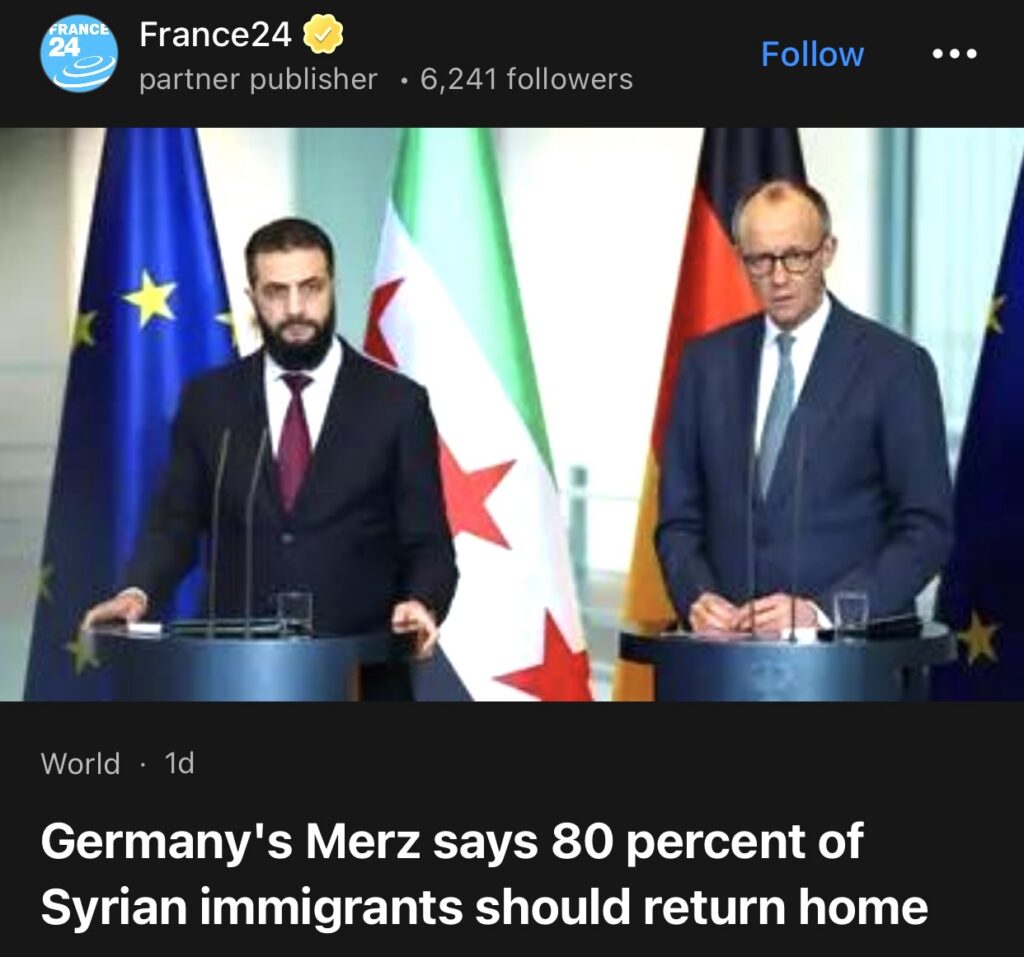 15。据France24报道,德国的梅尔茨表示,80%的叙利亚移民应当回国。