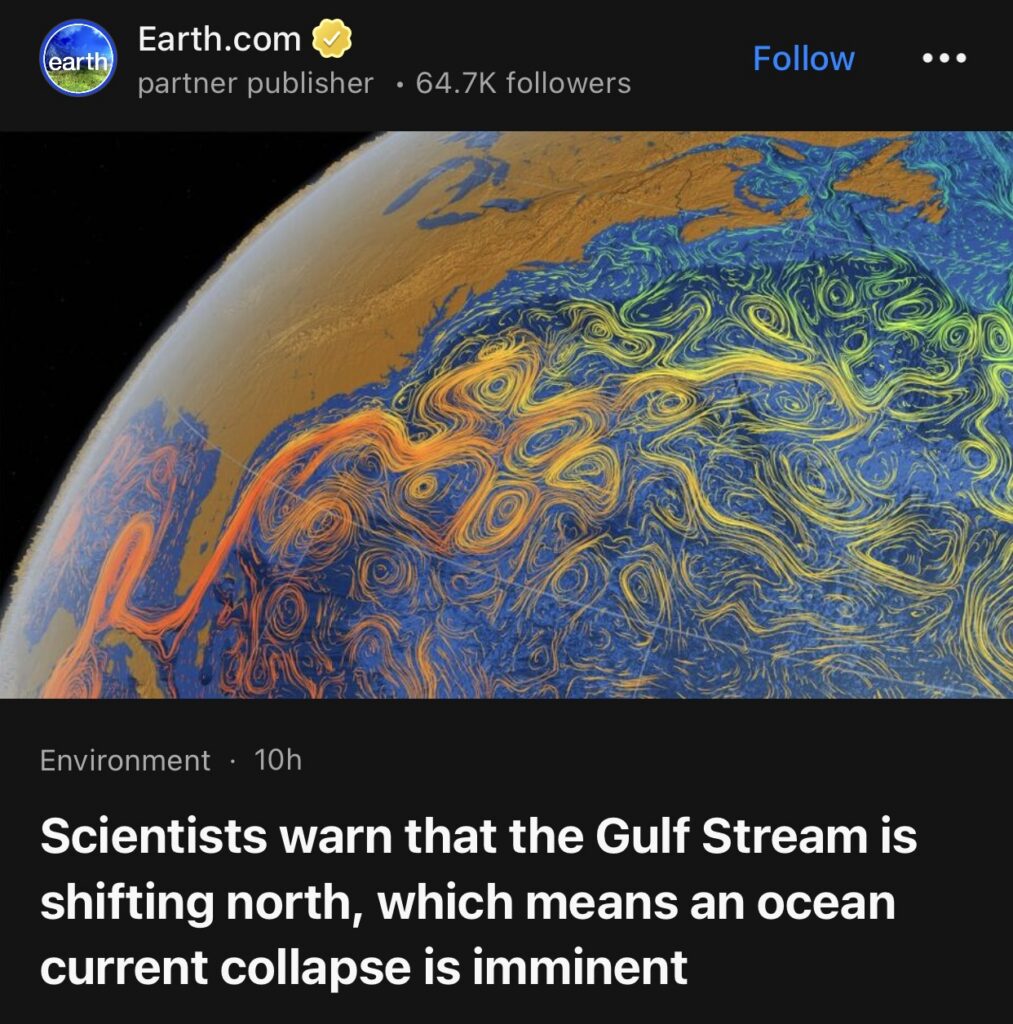 2。据Earth.com报道,科学家警告称,墨西哥湾暖流正向北偏移,这意味着洋流崩溃迫在眉睫。此前的研究表明,即使在全球变暖的背景下,AMOC(大西洋经向翻转环流)的崩溃仍可能导致欧洲部分地区急剧降温。