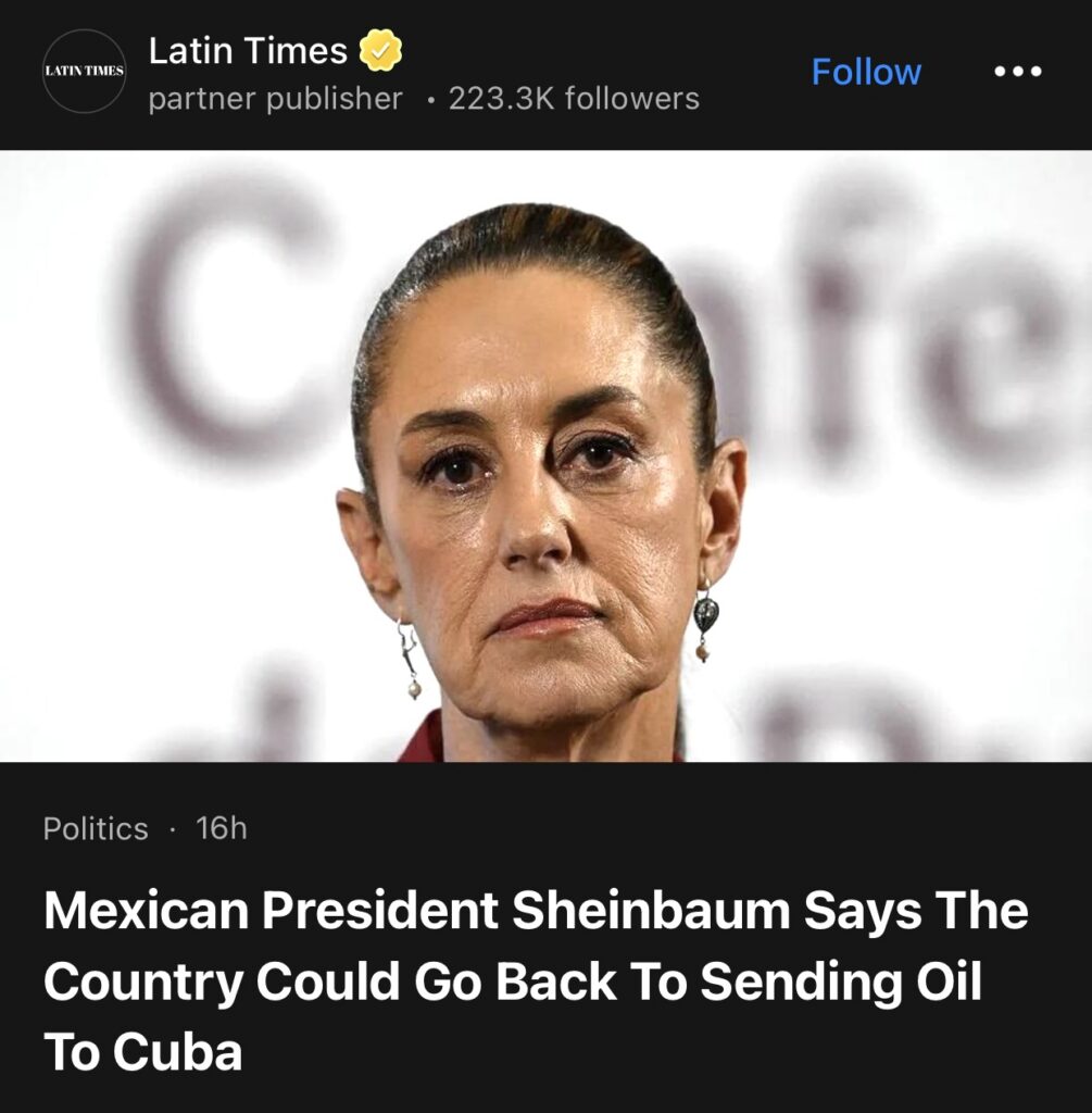 13。据Latin Times报道,墨西哥总统谢因鲍姆表示,该国可能恢复向古巴输送石油。