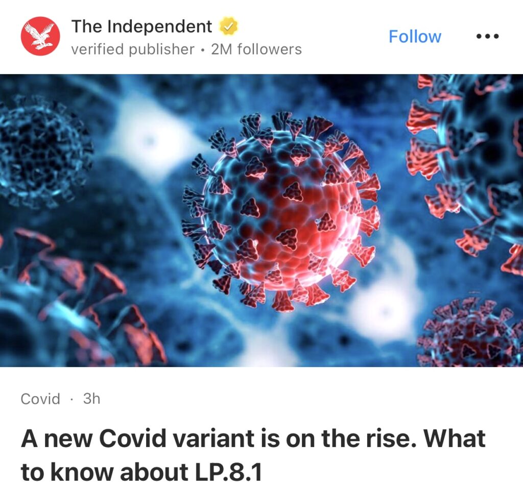 2。据The Independent报道,一种新的 Covid 变种正在兴起。LP.8.1 。在澳大利亚,这种病毒正在增加,在新南威尔士州,这种病毒占了近五分之一的 COVID 病例。在其他地区,这种病毒甚至变得更加普遍,例如,在英国,这种病毒至少占五分之三的病例。