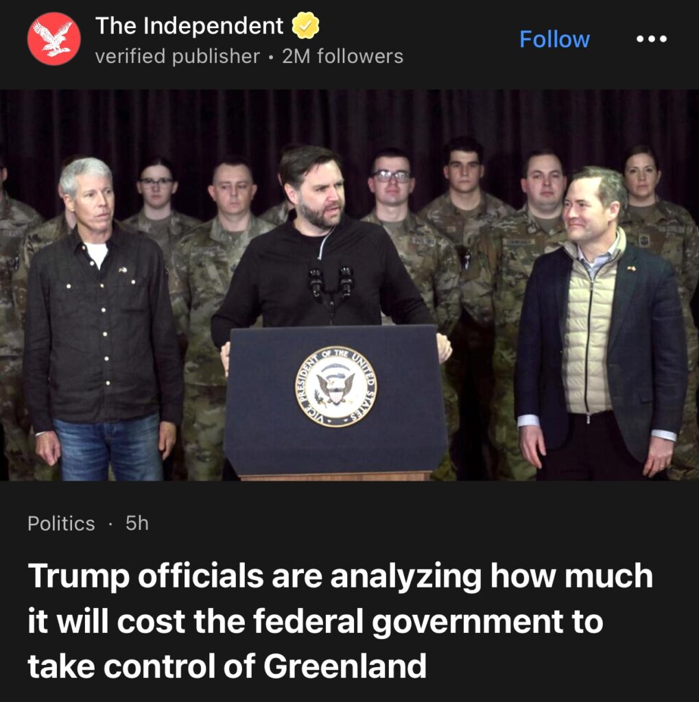 8。据The Independent报道,特朗普政府官员正在分析联邦政府控制格陵兰岛需要花费多少钱。