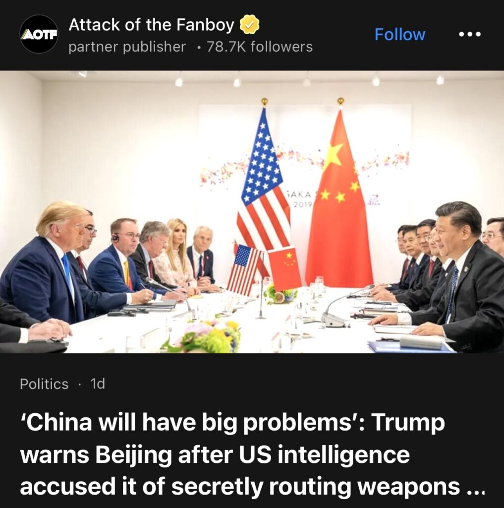 10。据Attack of the Fanboy 周一报道,”中国将面临大麻烦”:在美国情报部门指控北京通过第三国秘密向伊朗输送武器后,特朗普向其发出警告。