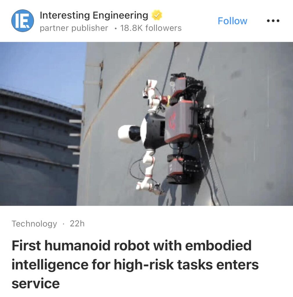 13。据Interesting Engineering 周一报道,首款具备具身智能、用于执行高风险任务的人形机器人投入使用。