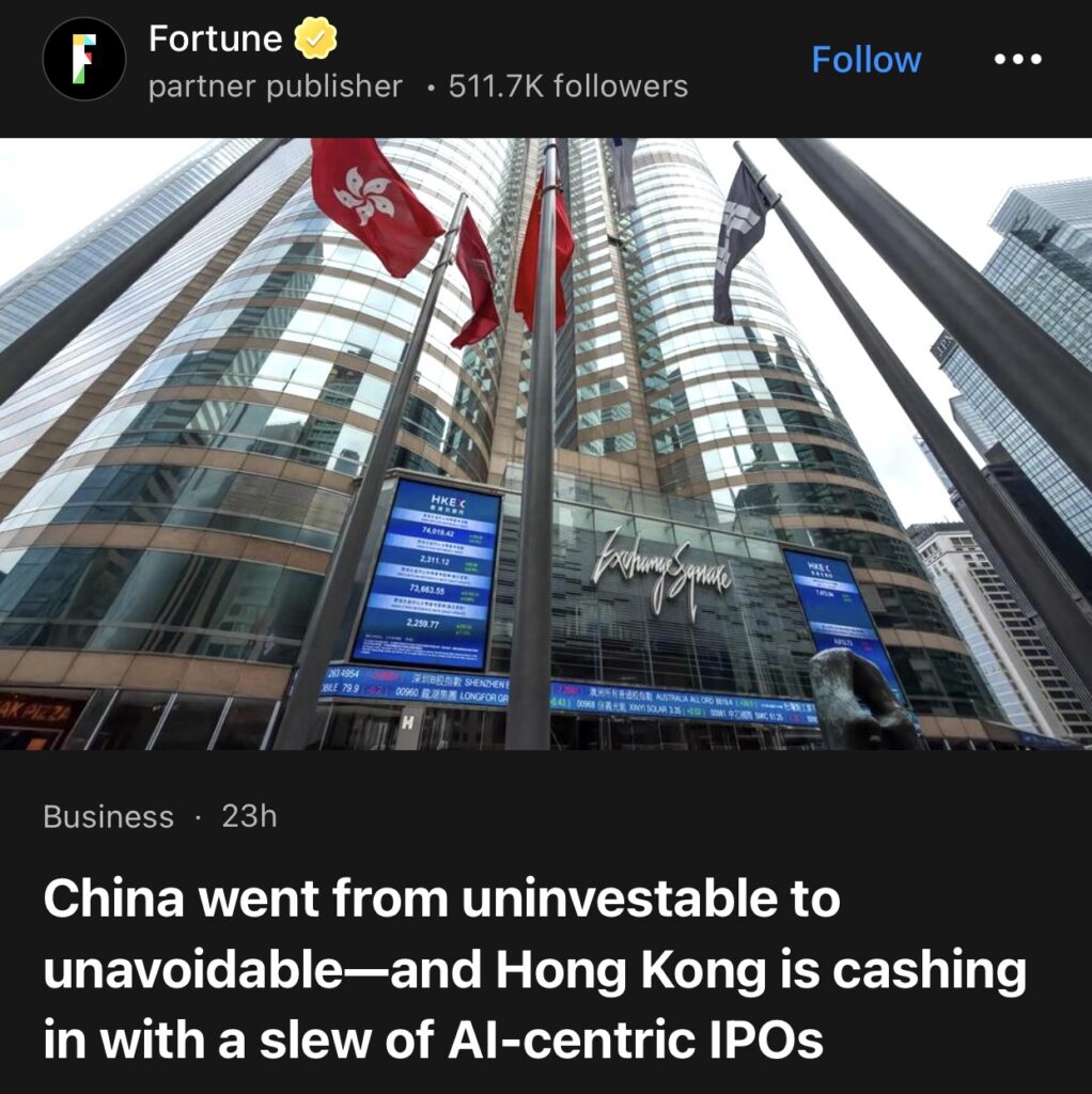 8。据Fortune 周一报道,中国已从“不可投资”转变为“不可回避”——而香港正凭借一系列以人工智能为核心的IPO从中获利。