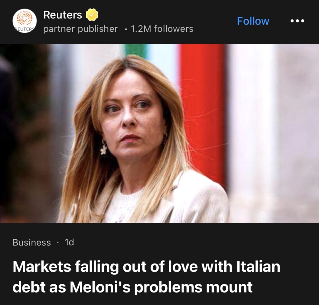 12。米兰,4月13日(路透社)——中东战事正将意大利的经济脆弱性暴露无遗;罗马方面对进口能源的高度依赖,加之2027年大选临近所带来的政府及财政不稳隐患,正令其国债魅力黯然失色。3月份,意大利的两年期借贷成本飙升了75个基点,创下自2022年以来的最大单月涨幅——这一增幅至少比其同类国家(法国、西班牙和德国)高出10个基点。